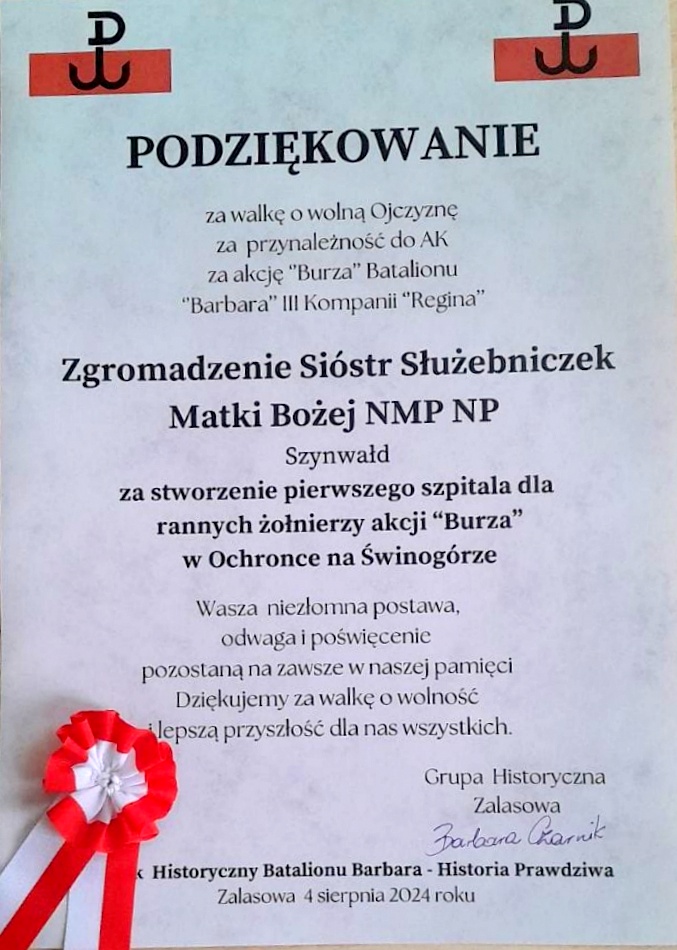 Podczas tego Pikniku Zgromadzenie Sióstr Służebniczek Starowiejskich zostało uhonorowane Podziękowaniem za walkę o wolną Ojczyznę, za przynależność do AK, za akcję ''Burza'' Batalionu Barbara III Kompanii '' Regina'' a szczególnie za stworzenie pierwszego szpitala dla rannych żołnierzy akcji ''Burza'' w Ochronce na Świniogórze.