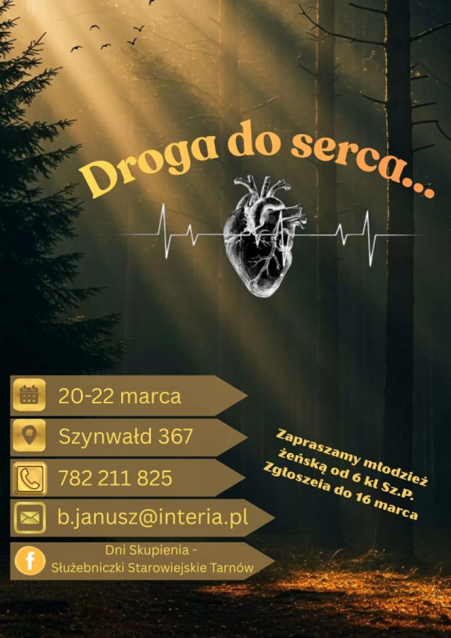 Zapraszamy młodzież żeńską od klasy 6 szkoły podstawowej na Dni Skupienia „Droga do serca” — czas zatrzymania, refleksji i spotkania z Bogiem oraz drugim człowiekiem w atmosferze ciszy i natury.