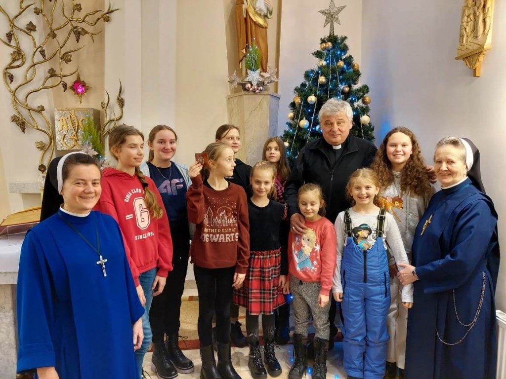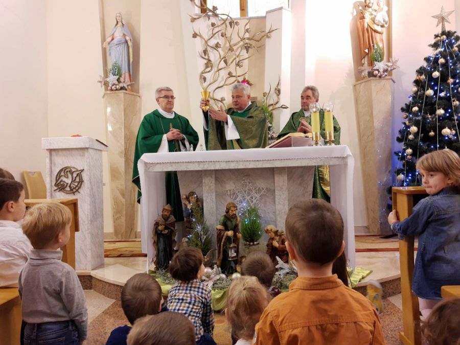 i Dziadków z okazji ich święta, dlatego zebrali się oni licznie na wspólnej modlitwie. Ksiądz kardynał zachęcił nas do modlitwy szczególnie za ubogich i chorych, którym na co dzień ofiarnie posługuje i otoczył gorącą modlitwa udręczoną wojną Ukrainę. Na zakończenie przedszkolaki otrzymały pamiątkowe, bożonarodzeniowe obrazki z błogosławieństwem papieża Franciszka. Dzieci zapewniły również, że będą pamiętały w modlitwie o Ojcu Świętym z czego postaramy się sumiennie wywiązać.