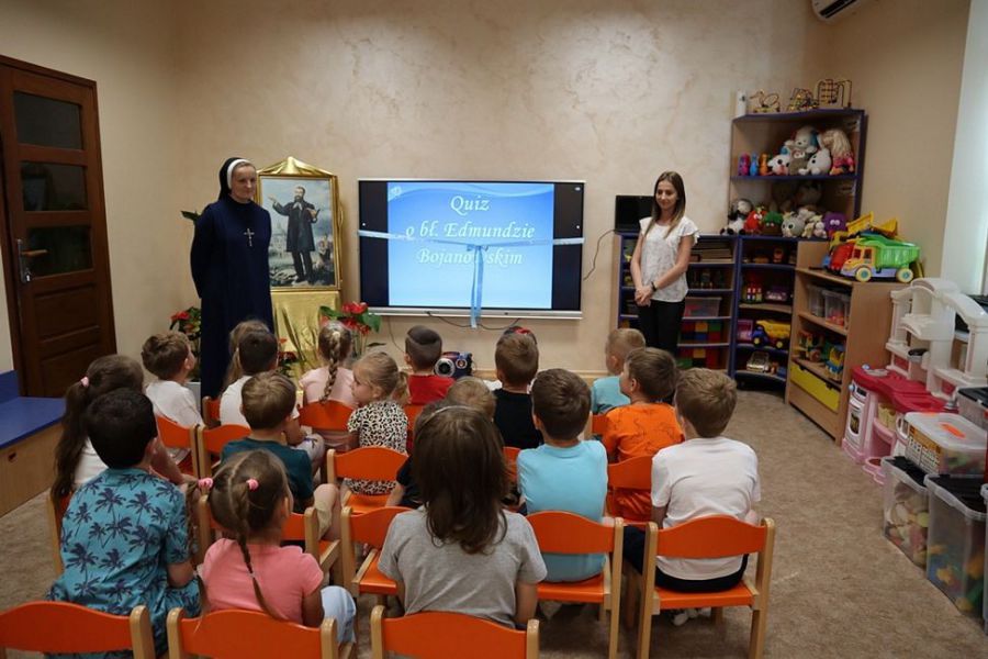 Dnia 22.06.2023 roku w Niepublicznym Przedszkolu Sióstr Służebniczek NMP NP. pw. bł. Edmunda Bojanowskiego w Gorlicach odbył się konkurs pt.: „Quiz wiedzy o błogosławionym Edmundzie Bojanowskim”. W latach 2022/2023 w przedszkolu realizowany był program „Na Edmundowych ścieżkach prawdy, dobra i piękna”. Patron programu bł. Edmund Bojanowski – jest Patronem przedszkola zaś obecny rok szkolny był jubileuszowym dla całej społeczności przedszkolnej – 25 lat od otworzenia przedszkola – ochronki. W tym wyjątkowym jubileuszowym roku, została zwrócona szczególna uwaga na postać patrona przedszkola – bł. Edmunda Bojanowskiego. W ciągu całego roku szkolnego systematycznie poszerzano wiedzę na temat bł. Edmunda Bojanowskiego, jego życia oraz wytworów. Pod koniec roku szkolnego w dniu 22.06.2023 r. dzieci mogły sprawdzić swoją wiedzę w konkursie na temat Patrona ich przedszkola. W konkursie wzięło udział 19 dzieci. Pytania konkursowe były wyświetlone na monitorze interaktywnym i odtworzone w formie nagrania audio. Quiz zawierał 24 pytania, w których uczestnik konkursu miał za zadanie zdecydować, która odpowiedź jest prawidłowa i zaznaczyć ją samodzielnie. Po udzieleniu prawidłowej odpowiedzi uczestnik zdobywał 1 punkt. Po udzieleniu odpowiedzi na wszystkie pytania – punkty były podliczane. Liczono również czas, który uczestnik potrzebował na odpowiedzenie na wszystkie pytania konkursowe. Po przeprowadzeniu konkursu ze wszystkimi zgłoszonymi uczestnikami podliczono punkty oraz czas w obecności siostry dyrektor i przyznano miejsca według wieku. I, II i III miejsca nagrodzono dyplomem oraz wręczono im nagrody, natomiast wszyscy pozostali uczestnicy za swoje zaangażowanie zostali obdarowani pamiątkowymi dyplomami za udział oraz drobnym upominkiem.