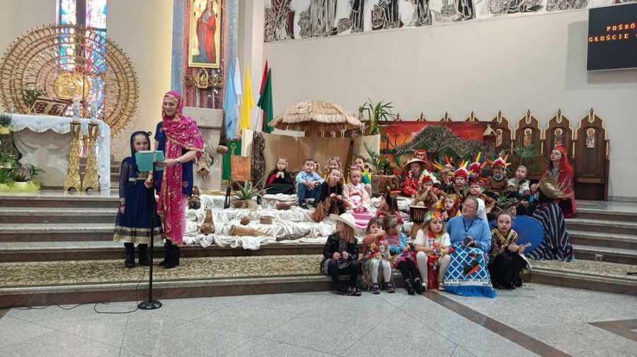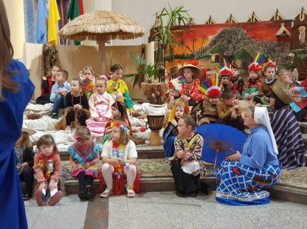 W związku ze świętowaniem Niedzieli Misyjnej została przygotowana dekoracja przedstawiająca życie dzieci w krajach misyjnych. Przed rozpoczęciem Mszy Świętej dzieci z księdzem misjonarzem Markiem Muszyńskim przybliżyły wszystkim zgromadzonym problemy, z jakimi borykają się milionowe rzesze ludzi, w tym dzieci, mieszkające na różnych kontynentach świata poprzez scenkę misyjną pt. ,,USŁYSZMY KRZYK DZIECI”. Zgromadzeni na Eucharystii wspólnie modlili się we wszystkich potrzebach dzieci z krajów misyjnych. Rodzice wraz z dziećmi w różnorodnych strojach misyjnych przygotowali oprawę liturgiczną Mszy Świętej: czytania liturgiczne, śpiew psalmu, procesja z darami. Ksiądz misjonarz Marek Muszyński wygłosił do wiernych kazanie, w którym opowiadał o swojej misyjnej posłudze w Afryce, zachęcał do pomagania misjonarzom poprzez modlitwę, pieniężne datki oraz udział w różnych akcjach charytatywnych na rzecz misji. Na zakończenie Mszy Świętej dzieci przy akompaniamencie instrumentów zaśpiewały piosenki: ,,Budujemy Kościół Boży” i ,,Taki duży, taki mały”.