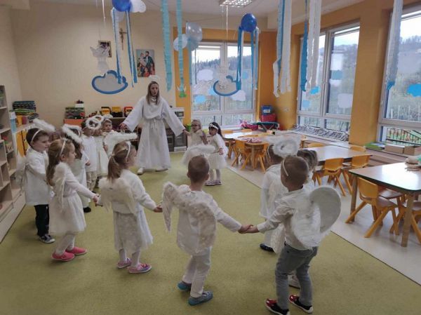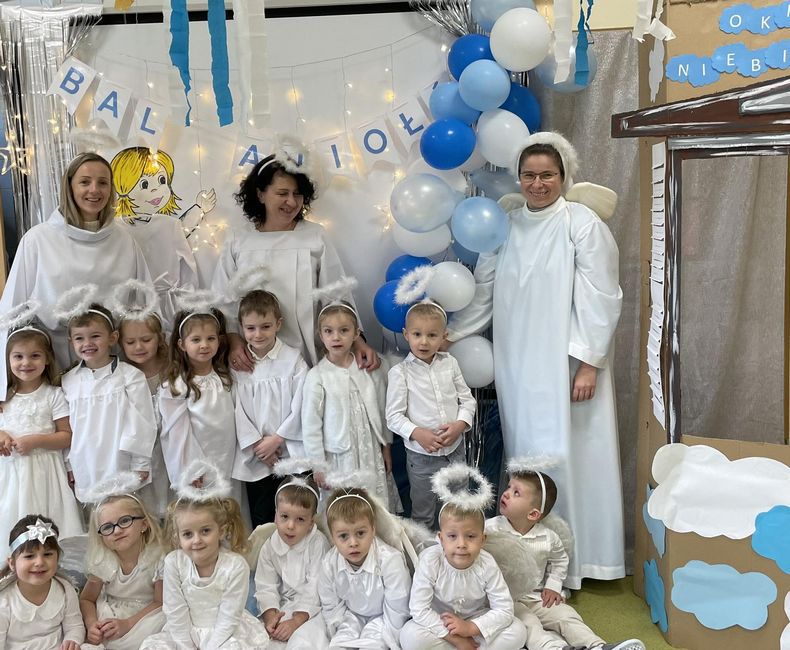 Koniec listopada to czas przedadwentowych zabaw i tańców. W naszym przedszkolu tradycyjnie wiąże się z wyczekiwanym przez dzieci Anielskim Balem, który w tym roku odbył się w czwartek 23 listopada 2023r. Również w tym roku dzieci bawiły się w "anielskich rytmach" przy anielskiej muzyce i w anielskim storju. Sale przedszkolne zamieniły się w tym dniu w Niebo, a grupy Małych i Pracowitych Aniołków w niebiańskich mieszkańców. Podczas konkursów, gier, zabaw rywalizacyjnych oraz tańców dzieci wraz z paniami i siostrami świętowały i wspólnie cieszyły się iż każdy z nas ma swojego Dobrego Anioła, który czuwa nieustannie nad nami. W tym dniu dzieci nie tylko bawiły się podczas balu, ale również uczyły się jak być dobrym „Aniołem dla innych”. Nie zabrakło także Anielskiego poczęstunku przygotowanego przez rodziców oraz miłych niespodzianek.
