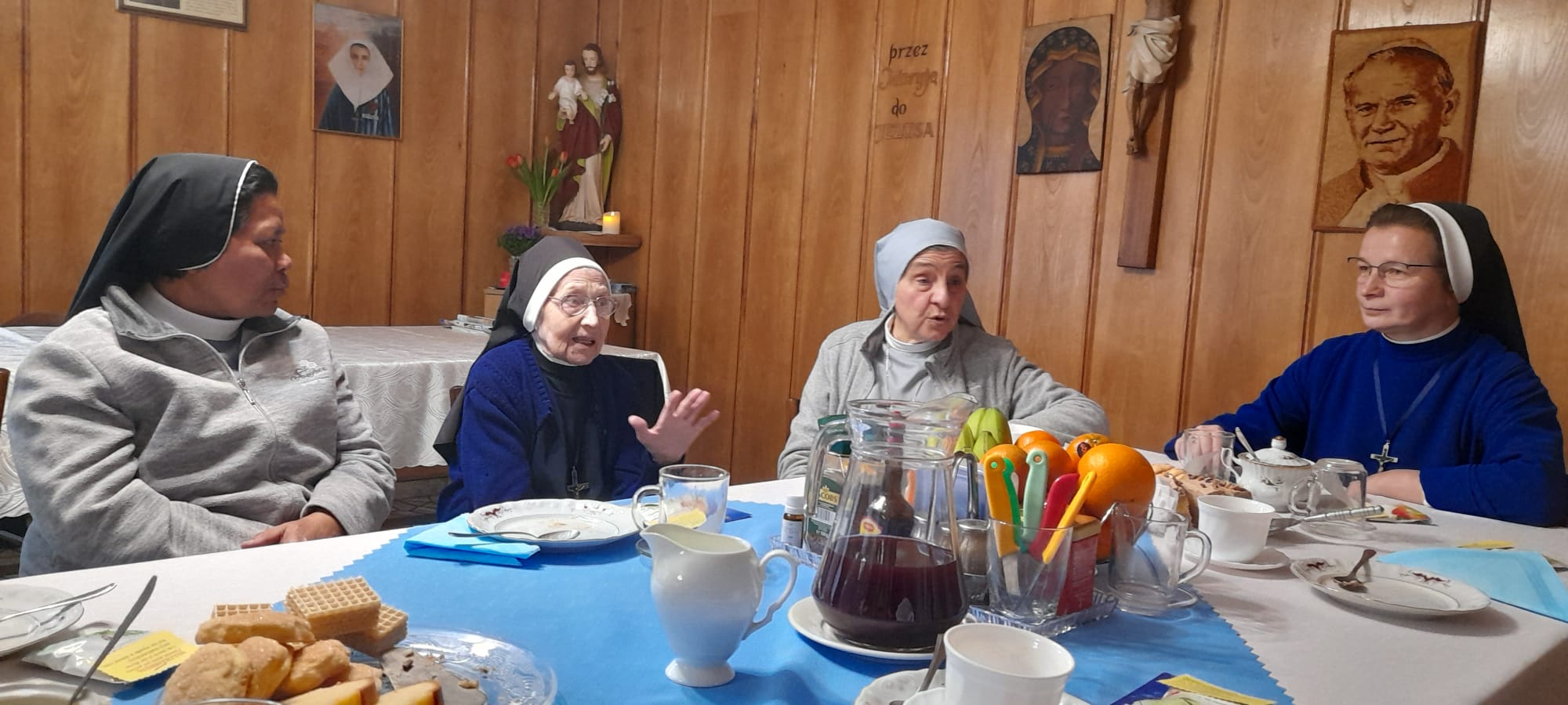 Wspólne spotkanie rozpoczęto modlitwą w kaplicy. Po modlitwie w radosnej atmosferze obiad. Podczas posiłku Siostry Kanosjanki, które przybyły do Polski z różnych stron świata, podzieliły się z nami swoimi wrażenia z pobytu w naszym kraju. Szczególne świadectwo dała siostra Rosemary, która przybyła do Polski w okresie zimowym i śnieg był dla Niej zaskoczeniem. Jednak szybko okazało się, że śnieg, zimno, brak zieleni i warzyw były dużym wyzwaniem dla Siostry, która pochodzi z kraju o innych warunkach klimatycznych. Tęsknota była ogromna, ale wówczas Siostra Rosemary przypomniała sobie w kaplicy słowa, które kiedyś, we Włoszech, powiedziała Panu Jezusowi, że gdziekolwiek Ją pośle tam będzie służyć. I tak służy w Polsce już od wielu lat, przyzwyczaiła się do warunków i pięknie mówi po polsku.