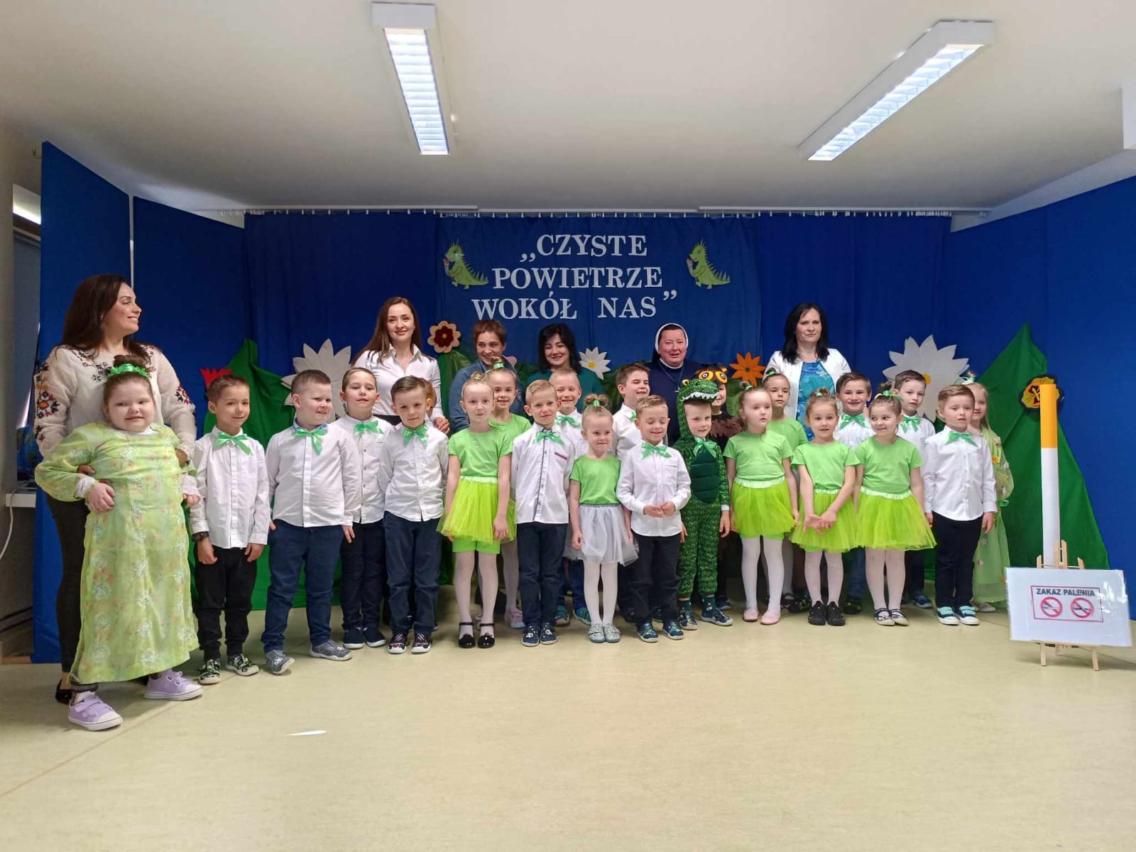 z grupy ,,Pszczółki” w ramach zajęć otwartych podsumowujących roczną realizację Programu ,,Czyste powietrze wokół nas”. Spotkaniu towarzyszyła wspaniała widownia: s. Dyrektor, Pani Dyrektor Państwowego Powiatowego Inspektoratu Sanitarnego w Dąbrowie Tarnowskiej, Pani Koordynator Projektu ,,Czyste powietrze wokół nas”, Rodzice, Babcie i Dziadkowie. Cele spektaklu było zwiększenie wiedzy Dzieci, Rodziców na temat skutków palenia papierosów i wdychania dymu papierosowego.